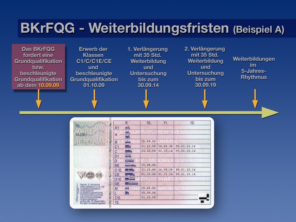 Bis zum 10.9.2013 (KOM) bzw. 10.9.2014 (LKW) muss jeder Fahrer der oben genannten Klassen eine Weiterbildung von 35 Zeitstunden nachweisen,die in fünf Blöcke von jeweils mindestens sieben Stunden aufgeteilt ist. Die Teilnahme an einzelnen Blöcken wird durch Teilnahmebescheinigungen nachgewiesen. Die Blöcke können bei verschiedenen Nutzfahrzeugfahrschulen und Ausbildungsstätten besucht werden.